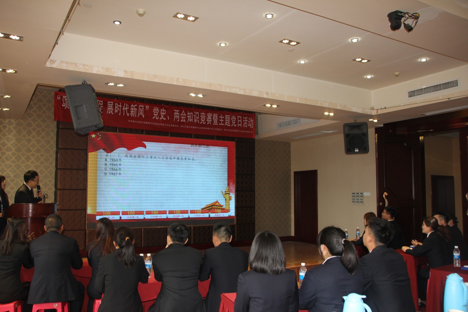 4月25日下午,中江水司組織開展“頌光輝歷程,展時代新風”黨史、兩會知識競賽暨主題黨日活動。公司90余名黨員干部職工參加了此次活動。