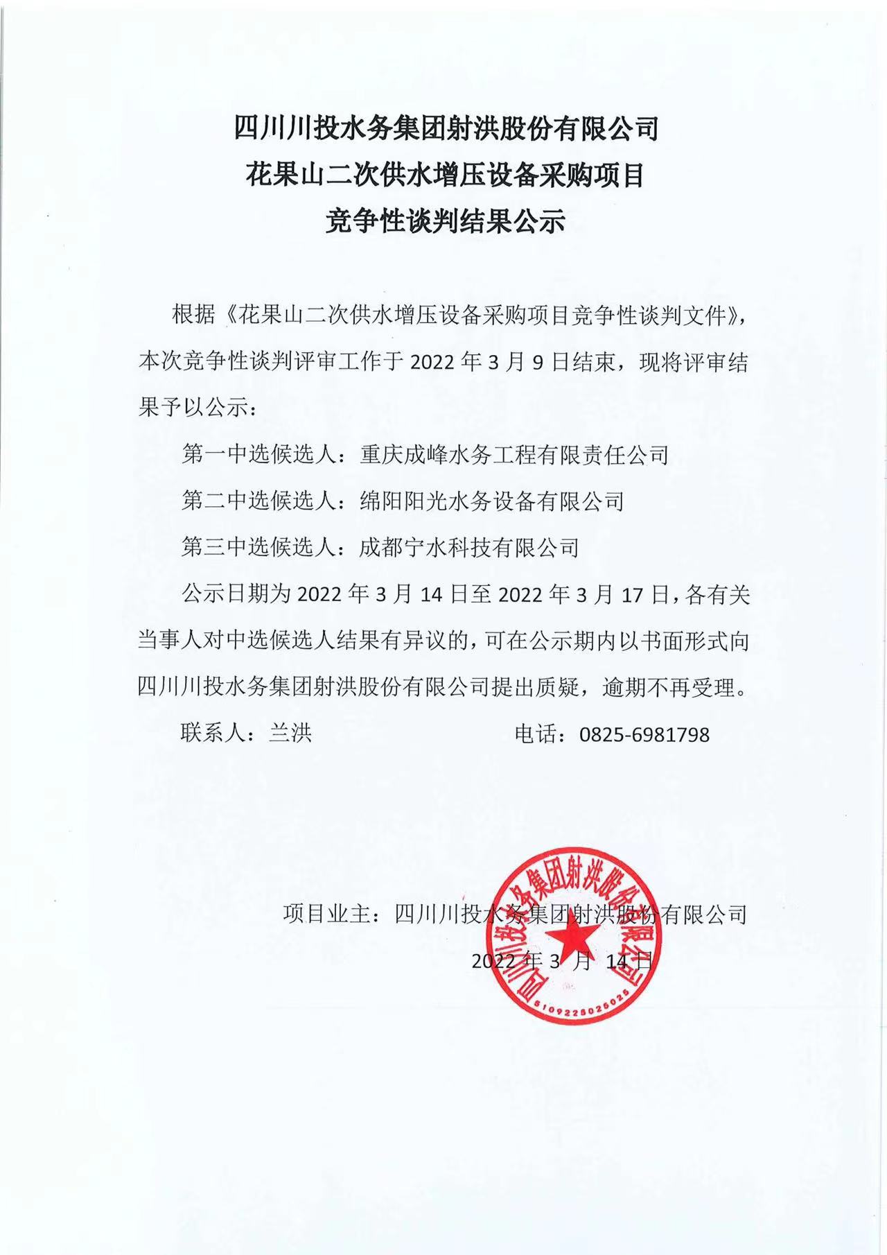 上一條:四川川投水務(wù)集團(tuán)股份有限公司射洪市新建自來水廠可行性研究報(bào)告編制項(xiàng)目比選公告(第二次)