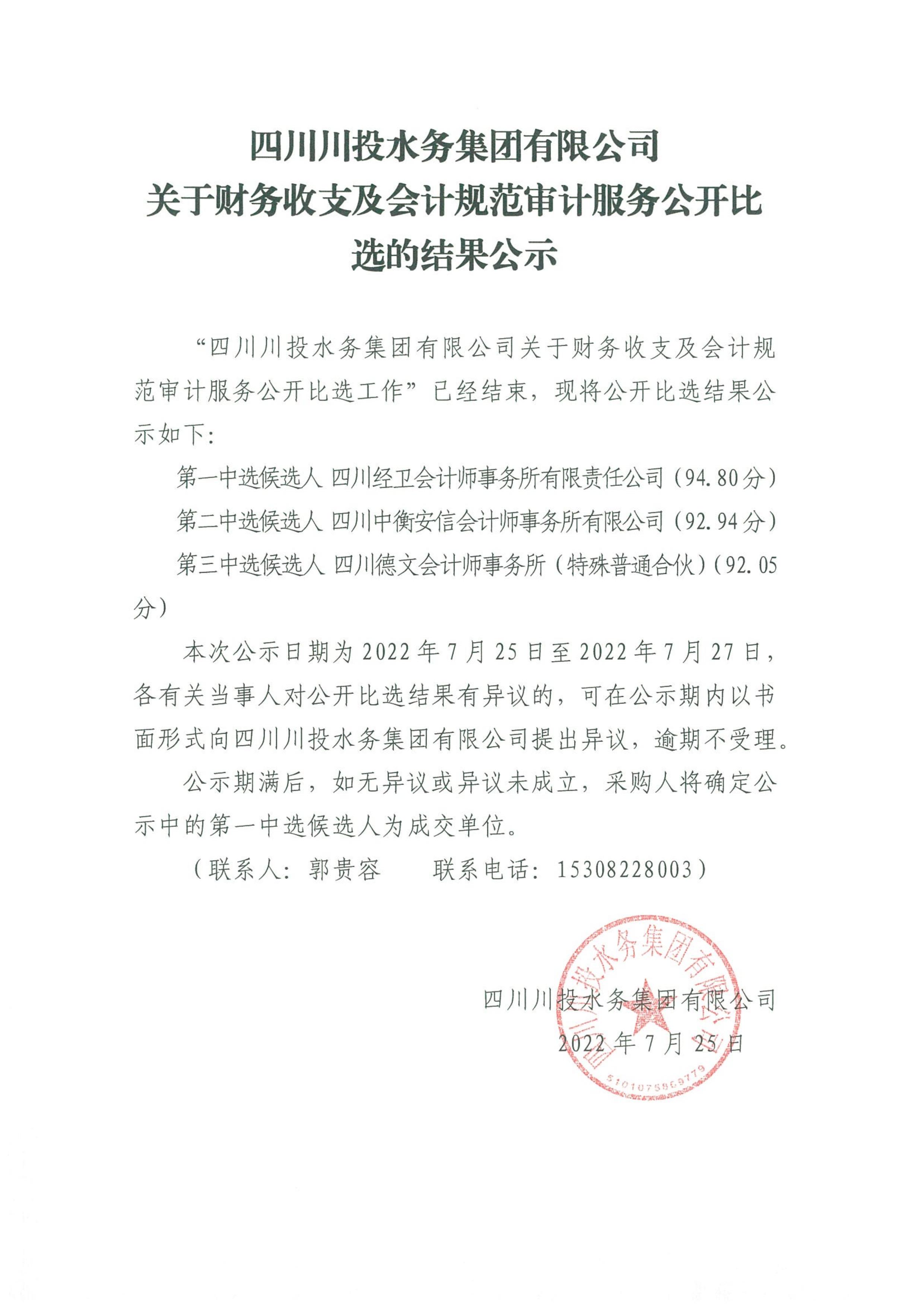 上一條:四川川投水務(wù)集團有限公司關(guān)于選聘財務(wù)收支及會計規(guī)范審計服務(wù)中介機構(gòu)的公告(第二次)