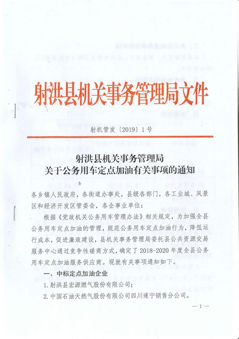 2019年1月2日,開(kāi)年上班第一天,宏源公司收到射洪縣公共資源交易服務(wù)中心的“射洪縣2018—2020年度公務(wù)用車定點(diǎn)加油政府采購(gòu)項(xiàng)目”的中標(biāo)通知書。在此次全縣公務(wù)用車定點(diǎn)加油采購(gòu)項(xiàng)目競(jìng)爭(zhēng)性磋商中,宏源公司以406分第一名的最高評(píng)審得分成功中標(biāo)。