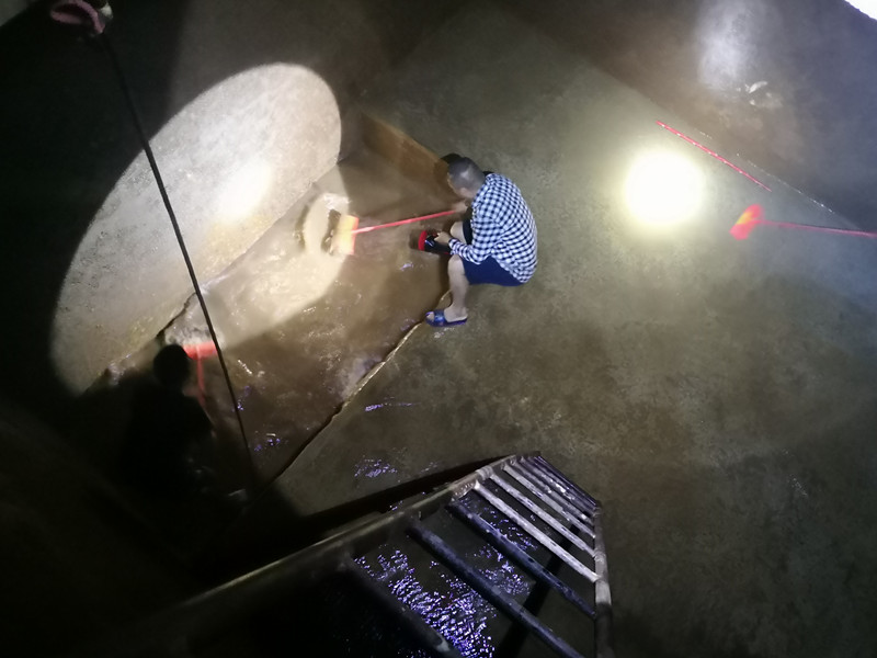清洗隊(duì)員由水廠負(fù)責(zé)人李明遠(yuǎn)親自帶隊(duì),從清水池進(jìn)水口向出水口有序推進(jìn),埋頭苦干的員工,分不清額頭上是汗水還是水漬,僅聽見笤帚清洗的水聲在清水池四壁回響,水中的沉積物也在一行人的清洗中越來越少,身后流入的潺潺細(xì)流也變得清冽無比,在燈光照耀下粼粼泛光。