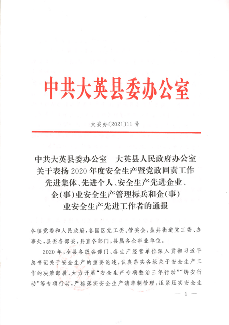 2月19日,大英縣召開安全生產(chǎn)工作會(huì)。會(huì)上,大英水司榮獲“安全生產(chǎn)先進(jìn)企業(yè)”榮譽(yù)稱號(hào)。