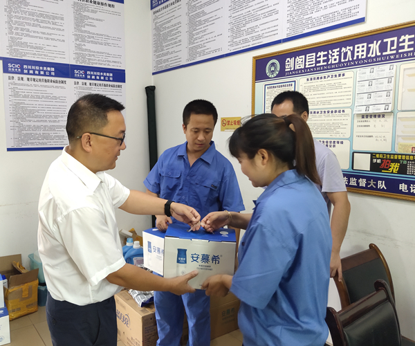 時(shí)值盛夏,連日來(lái)劍閣縣暴雨和烈日交替,高溫與高濕度的天氣讓大家仿佛置身于一所天然的“桑拿房”。7月22日,川投水務(wù)劍閣公司黨支部委員、副總經(jīng)理、工會(huì)主席韓名泉率工會(huì)委員朱強(qiáng)、王雪萍一行冒著雨、頂著“桑拿”天氣深入到普安、下寺收費(fèi)大廳和制水廠(chǎng),為奮戰(zhàn)在一線(xiàn)的職工送去了藿香正氣液、毛巾、洗衣液、牛奶等夏季常備防暑降溫物品,并向他們轉(zhuǎn)達(dá)了公司領(lǐng)導(dǎo)的慰問(wèn)和關(guān)懷。