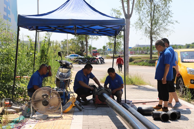 驕陽似火,室外溫度高達(dá)45攝氏度以上,在沒有任何遮擋物的情況下,維修隊員頂著烈日、冒著酷暑,他們個個汗如雨下,卻依然咬牙堅持,毫不猶豫地與時間賽跑,能早一刻通水,該片區(qū)的用戶就能減少一份酷熱!搶修工作有條不紊的進(jìn)行著:清理積水、開挖溝槽、切割和熱熔塑料管材、焊接斷面……在天然的“桑拿房”里,加上工作電機(jī)散發(fā)岀的灼熱,維修隊員身上的衣衫早己被汗水浸透了一遍又一遍,溝槽里空間狹小,濕熱難耐,但他們對搶修工作卻沒有絲豪怨言和懈怠。與此同時,公司緊急聯(lián)系市政管網(wǎng)用水車送水(共計20余噸)至健宏加氣站、中石化加油站和周邊居民家中,有效緩解了群眾短期內(nèi)生活用水問題。