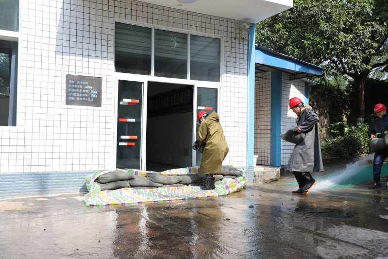 防洪防汛防澇應急演練,模擬在天氣突然強降雨的情況下,值班人員發(fā)現(xiàn)險情向部門負責人報告,部門負責人接到險情報告并請示龔總后,按照演練方案立即啟動防洪、防汛、防澇應急預案。參演人員迅速采取應急措施,用擋水板、沙袋進行防護,阻擋洪水進入泵房,泵房內(nèi)有積水時迅速用排水泵將積水排出泵房外,同時水質(zhì)化驗人員對水質(zhì)進行檢測,水質(zhì)檢測后演練結(jié)束。
