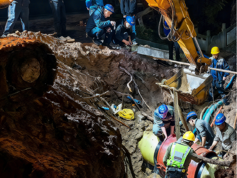隨后,朱禹迅速按照預(yù)案,成立由其本人擔(dān)任組長、班子其他成員任副組長,工程技術(shù)部、綜合管理部、客戶服務(wù)中心、供水部等部門負(fù)責(zé)人及技術(shù)骨干為成員的搶險(xiǎn)指揮部,并下設(shè)兩個(gè)搶險(xiǎn)小組:第一組由公司常務(wù)副總經(jīng)理秦榮負(fù)責(zé),承擔(dān)中金快通興隆鎮(zhèn)凱歌大道中段供水主管的搶修任務(wù);第二組由公司副總經(jīng)理杜剛、高峰共同負(fù)責(zé),承擔(dān)繼光水廠DN700出水母管的搶修任務(wù)。指揮部確定了 “先控險(xiǎn)、再修復(fù)、保民生、兩線同時(shí)作戰(zhàn)”的搶險(xiǎn)總思路,并立下 “28日早上9時(shí)前恢復(fù)縣城區(qū)正常供水”的硬性目標(biāo)。各部門職責(zé)清晰細(xì)化:工程技術(shù)部主攻現(xiàn)場搶修,綜合管理部負(fù)責(zé)信息發(fā)布,客戶服務(wù)中心對接用戶溝通,供水部負(fù)責(zé)供水調(diào)度,全體人員隨即進(jìn)入“戰(zhàn)時(shí)狀態(tài)”,全時(shí)輪班投入搶險(xiǎn)工作中。