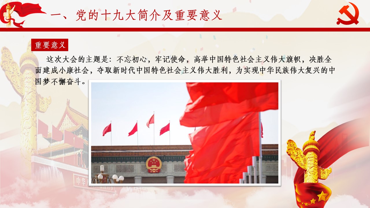 中國(guó)共產(chǎn)黨人的初心和使命,就是為中國(guó)人民謀幸福,為中華民族謀復(fù)興。中國(guó)共產(chǎn)黨第十九次全國(guó)代表大會(huì),是在全面建成小康社會(huì)決勝階段、中國(guó)特色社會(huì)主義進(jìn)入新時(shí)代的關(guān)鍵時(shí)期召開(kāi)的一次十分重要的大會(huì)。大會(huì)的主題是:不忘初心,牢記使命,高舉中國(guó)特色社會(huì)主義偉大旗幟,決勝全面建成小康社會(huì),奪取新時(shí)代中國(guó)特色社會(huì)主義偉大勝利,為實(shí)現(xiàn)中華民族偉大復(fù)興的中國(guó)夢(mèng)不懈奮斗。習(xí)近平強(qiáng)調(diào),不忘初心,方得始終。中國(guó)共產(chǎn)黨...